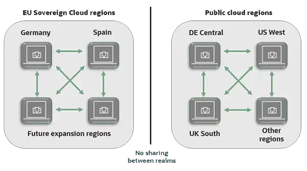 - Hohe Verfügbarkeit: Die EU Sovereign Cloud umfasst zwei Regionen, um Disaster-Recovery-Architekturen innerhalb der EU-Grenzen zu unterstützen. Darüber hinaus verfügt jede Region über drei Fault Domains, die zusätzliche Hardware-Ausfallsicherheit bieten. Durch dieses Design lässt sich die Gruppierung von Workloads auf derselben physischen Hardware vermeiden. Ein Hardware-Ausfall oder eine Wartung der Computer-Hardware haben somit keine Auswirkungen auf Instanzen in anderen Fault Domains.