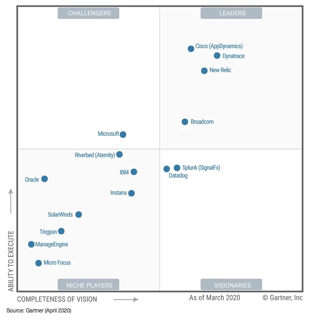 Ein Blick auf den Magic Quadrant 2020 des Marktforschungsunternehmens Gartner veranschaulicht die Marktposition der unterschiedlichen APM-Anbieter.