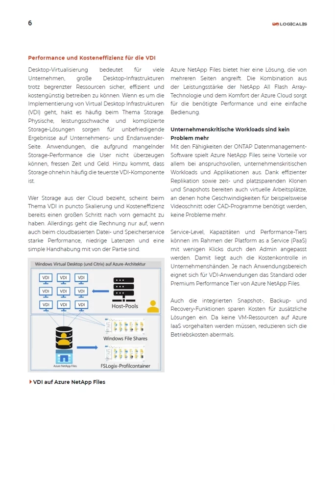 Wenn es um die Implementierung von Virtual Desktop Infrastrukturen (VDI) geht, hakt es häufig beim Thema Storage. Physische, leistungsschwache und komplizierte Storage-Lösungen sorgen für unbefriedigende Ergebnisse auf Unternehmens- und Endanwender-Seite. Azure NetApp Files bietet hier eine Lösung, die von mehreren Seiten angreift. Die Kombination aus der Leistungsstärke der NetApp All Flash Array-Technologie und dem Komfort der Azure Cloud sorgt für die benötigte Performance und eine einfache Bedienung.