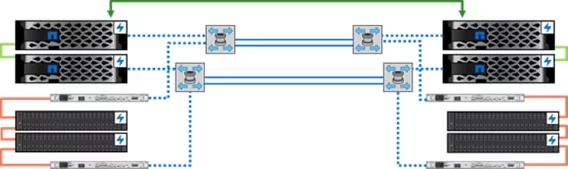 Die bis Ontap 9.3 eingesetzten NetApp MetroCluster verwenden ausschließlich eine FC Verbindung, um die Daten synchron auf zwei Seiten zu spiegeln. Das hat zur Folge, dass 4 dedizierte Fibre Channel Switche erforderlich sind, die zwei redundante Fabrics zur Verfügung stellen. Die auf SAS Technologie basierenden Disk Shelfs werden mittels FC-SAS Bridges des Herstellers ATTO an die Fabrics verbunden. Zusätzlich wird eine FCVI Karte pro NetApp Storage Node für die Spiegelung der NVRAM Inhalte eingesetzt.